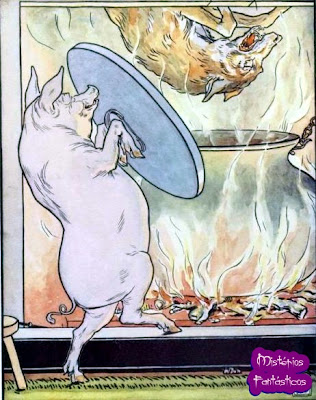 O lobo não pensava no que poderia acontecer, mas quando pulou dentro, caiu em uma panela, que o porco tinha colocado para ferver no fogo, assim, o lobo e os outros dois porquinhos que ainda estavam em seu estômago se tornaram o jantar do porco.